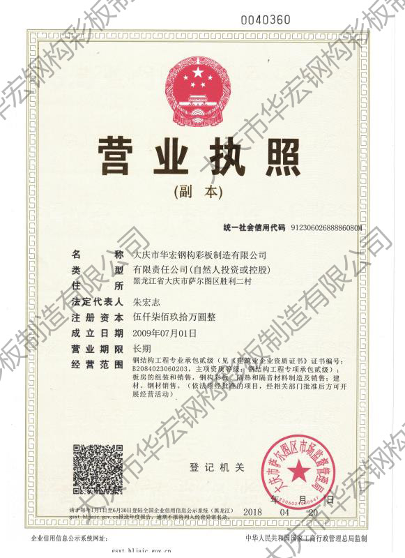 華宏鋼構始建于2009年8月9日,總部位于大慶市薩爾圖區南一路13號,現有大慶市華宏鋼構彩板制造有限公司、黑龍江省華宏力安綠建科技有限公司、大慶市華宏鋼構彩板制造有限公司長春分公司、黑龍江省海森新材料科技有限公司、大慶市瑞和通螺栓廠五家工業企業形成了以彩板復合板、裝配式鋼結構建筑、保溫材料、配件制造為主的五大生產基地,占地總面積 20余萬平方米,生產車間5萬平方米。中高層管理干部26 人,高級工程師9人,各類國家注冊執(zhí)業人員 32 人,車間技工 260人,專業安裝隊伍 10 余支,帶動就業 500